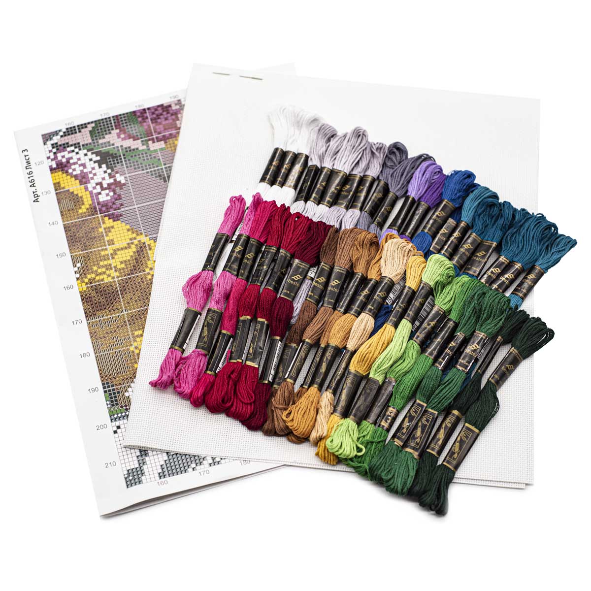 В наборе: канва Aida 18, нитки мулине Bestex из стопроцентного хлопка, игла для вышивания, цветная схема, инструкция.
